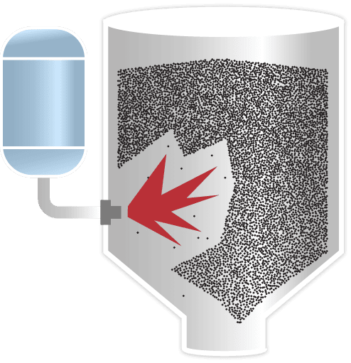 Industrial Air cannons are a pneumatic flow aid. In a typical application, air is compressed to 100 psi in a tank. When triggered, the valve opens and releases a high-magnitude blast that displaces stalled material.