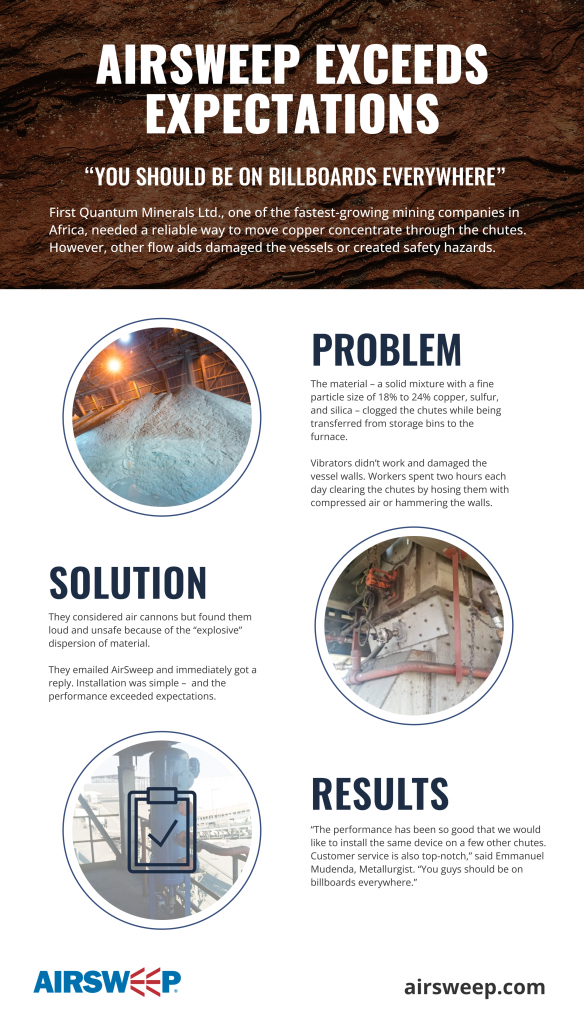 First Quantum Minerals Ltd., one of the fastest-growing mining companies in Africa, needed a reliable way to move copper concentrate through the chutes. However, other flow aids damaged the vessels or created safety hazards.