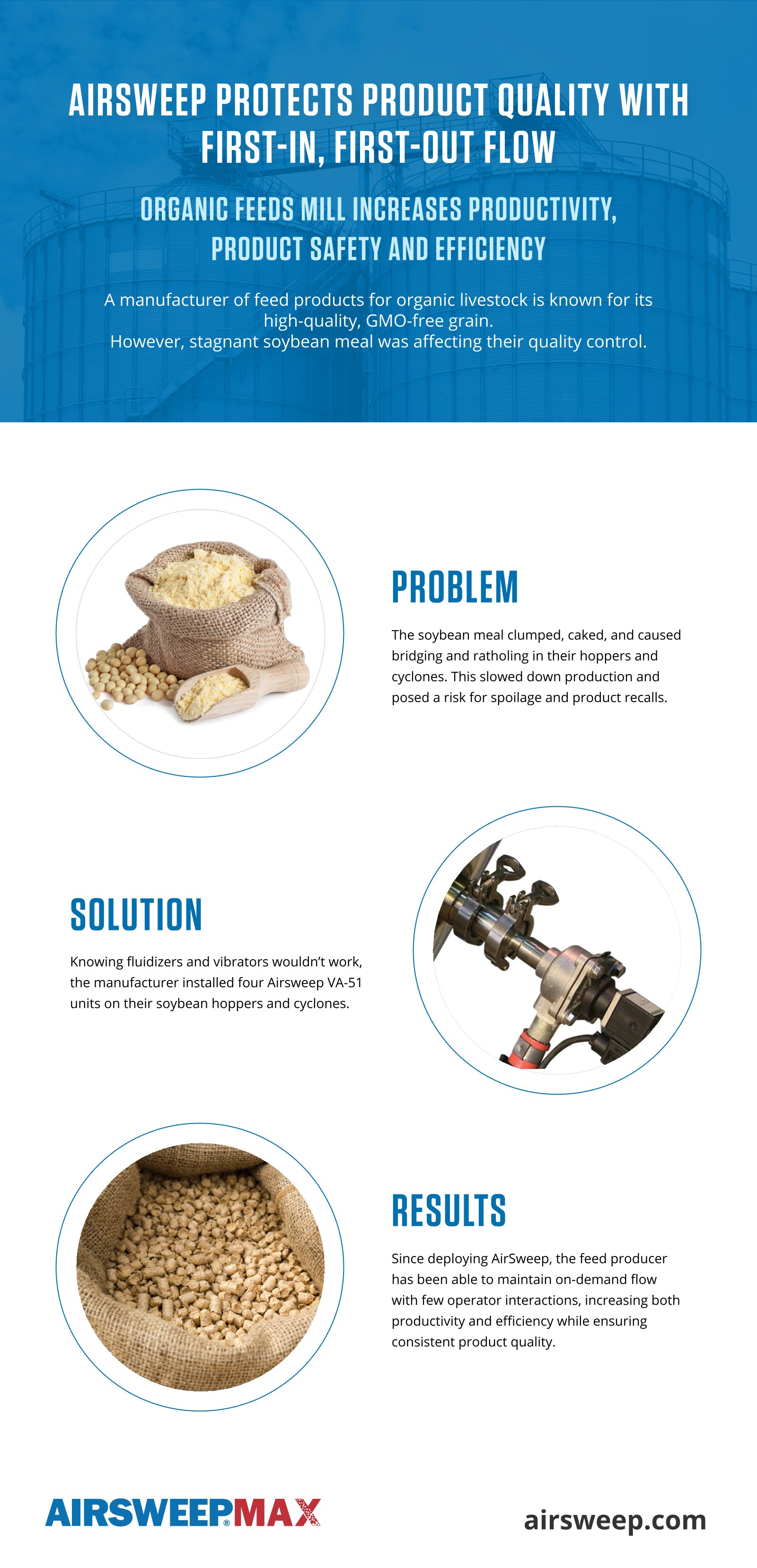 A producer of feed products for organic livestock is known for its high-quality, GMO-free grain. This company runs a certified-organic facility and uses computerized batching and mixing to protect its product integrity. However, a recurring problem affected its quality control: stagnant soybean meal.