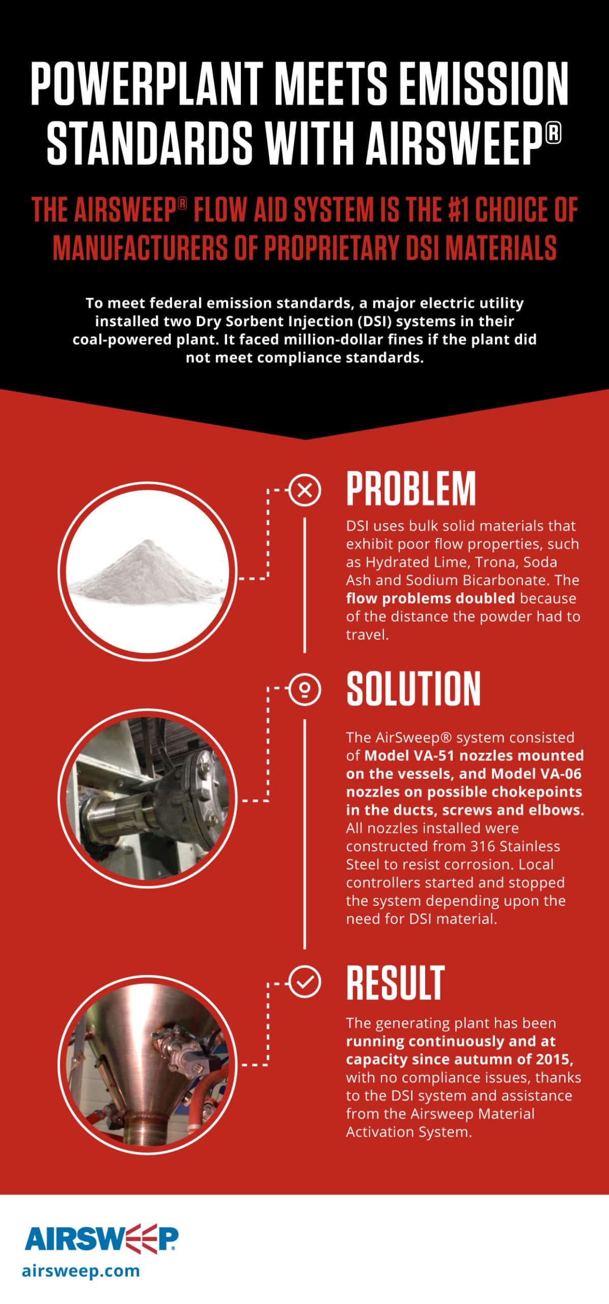 The utility contacted Control Concepts, Inc., manufacturer of the AirSweep® Material Activation System. The AirSweep system has become the default flow aid choice among many manufacturers of proprietary DSI systems, as well as among some of the major manufacturers of DSI materials used in those systems. These manufacturers know that the AirSweep system can provide on-demand flow of a wide variety of DSI materials, including Hydrated Lime, Trona, Soda Ash, Calcium Carbonate, Sodium Bicarbonate and others. Each AirSweep nozzle delivers a powerful pulse of air or inert gas, knifing between the material and the inner contact surface of the vessel, chute, duct, etc., to break friction and immediately restore flow. Control Concept’s key Midwest distributor worked closely with the utility and the generating plant’s personnel to design an effective system. An AirSweep system was installed consisting of Model VA-51 nozzles mounted on the vessels, and Model VA-06 nozzles mounted in the numerous possible chokepoints in the ducts, screws and elbows. All nozzles installed were constructed from 316 Stainless Steel to resist corrosion. Local controllers were provided, tying into the plant’s DSL system to start and stop the system depending upon the need for DSI material.