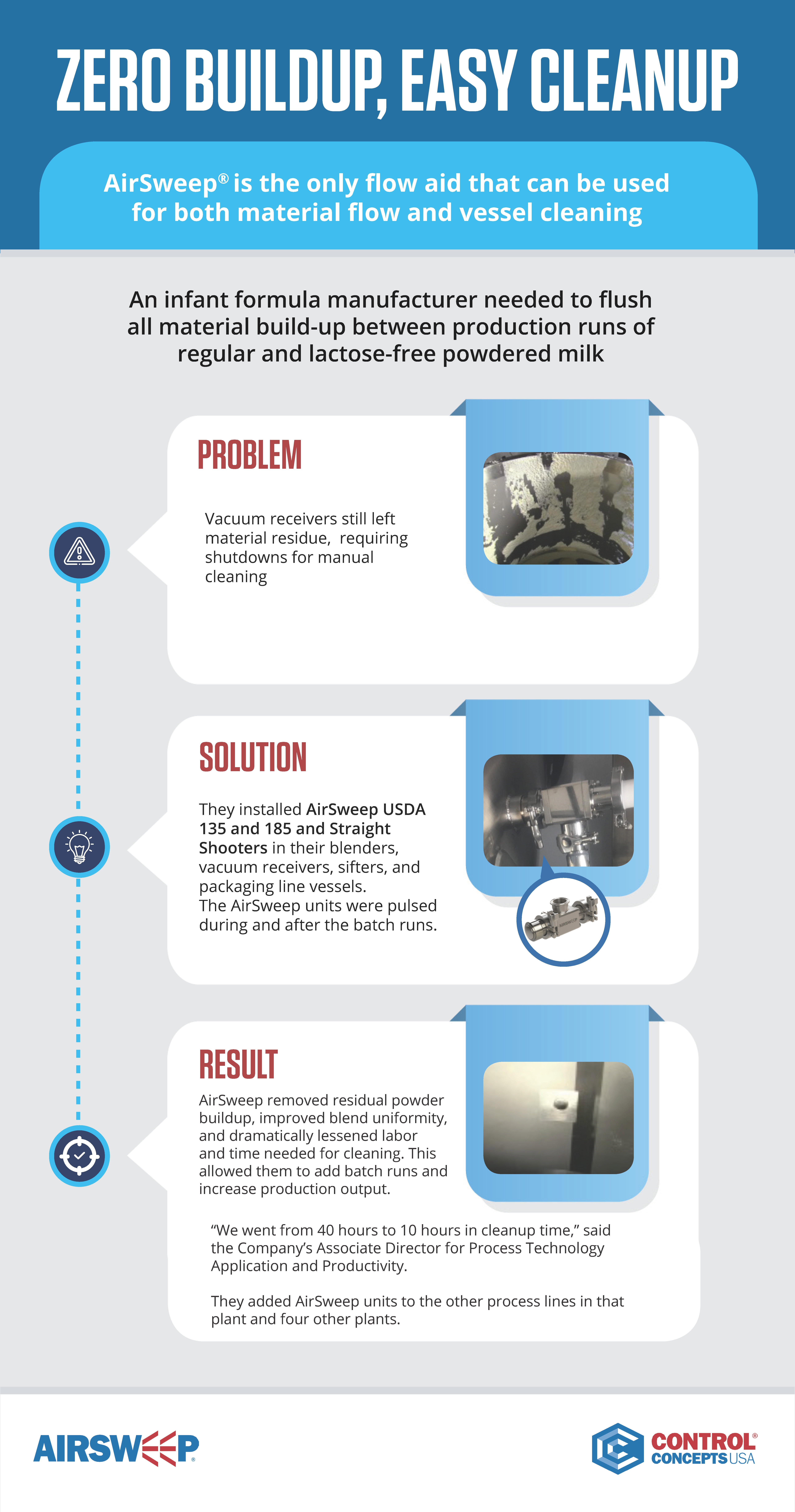 The manufacturer installed AirSweep USDA 135 and 185 and Straight Shooters in their blenders, vacuum receivers, sifters, and packaging line vessels. By pulsing the AirSweep units during and after the batch runs, they found that the powerful air pulses swept the vessel walls and inner surfaces of residual powder buildup. This made a significant, positive impact on blend uniformity and dramatically lessened the labor and time needed to clean after the batch runs were completed. This allowed them to add batch runs and increase production output.