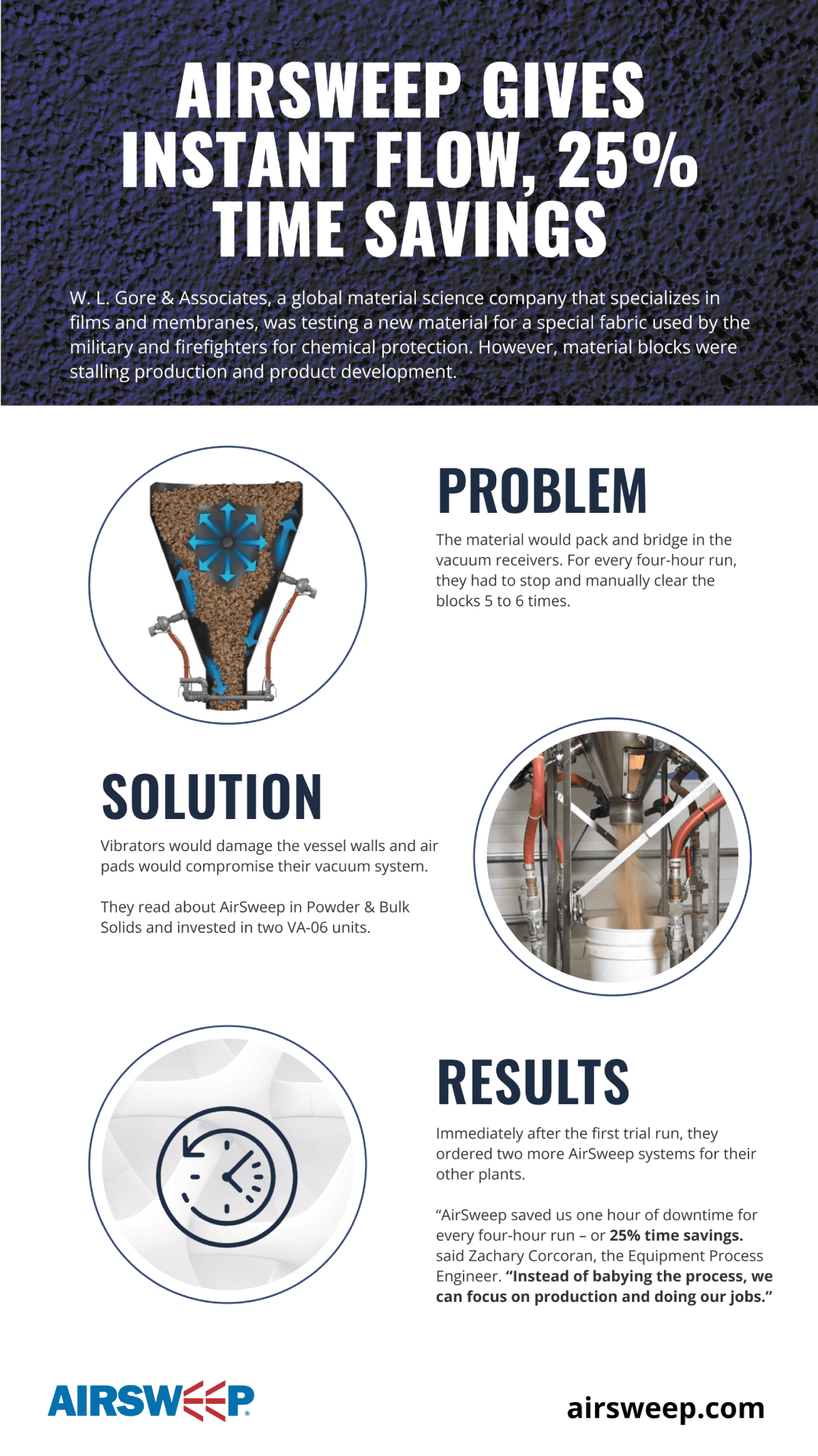 And unlike other pneumatic flow aids, the AirSweep nozzle also released very short, controlled air pulses. It was safe to use in a vacuum system, and more energy efficient.