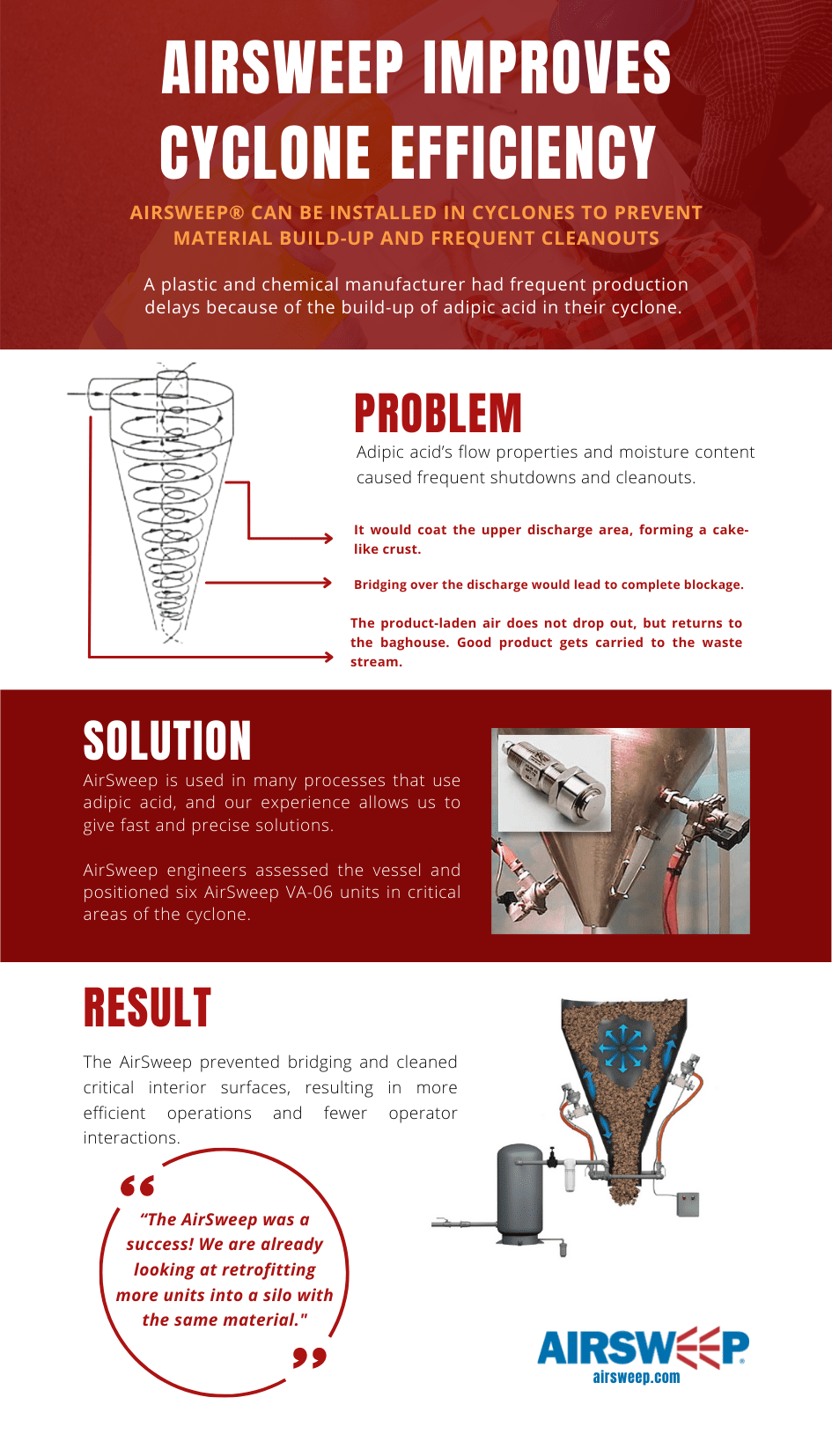 The AirSweep prevented bridging and cleaned critical interior surfaces, resulting in more efficient operations and fewer operator interactions. “The AirSweep was a success! We are already looking at retrofitting more units into a silo with the same material.”